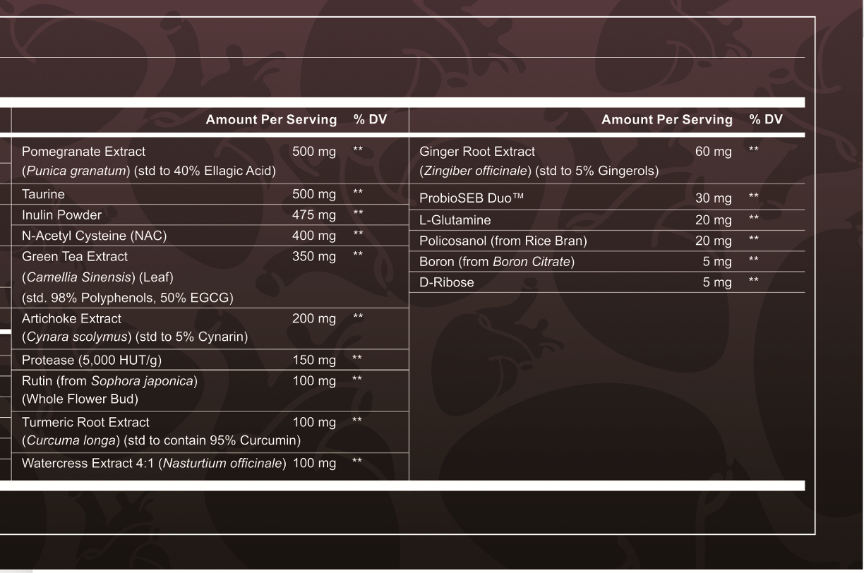 Each clinically studied compound, such as Niacin, Policosanol, Artichoke Extract, Boron, Pomegranate, D-Ribose, Turmeric, Fiber, and bioavailable Collagen help to lower LDL, eliminate inflammation, and improve vascular function through plaque regression and restoration of endothelial function, while also nourishing metabolic and digestive pathways for maximal cardiovascular support.*